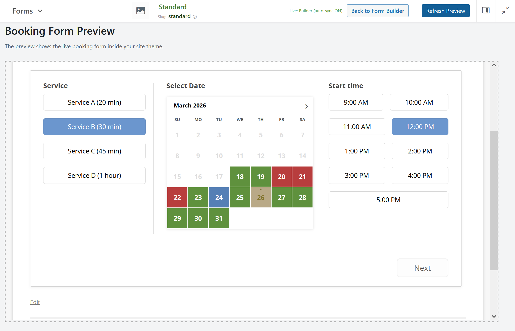 - • Live visual preview while building and editing the form.